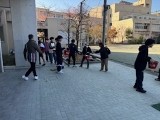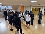 即席担架の作り方から運び方、バケツリレー、心肺蘇生法などを学びました。
