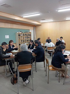 「主体的に考える生徒を育てるには ~授業、学校行事、家庭および地域の観点で~」をテーマに、小グループで60分ほど話し合い、全体会で共有しました。