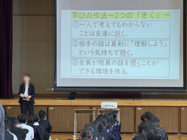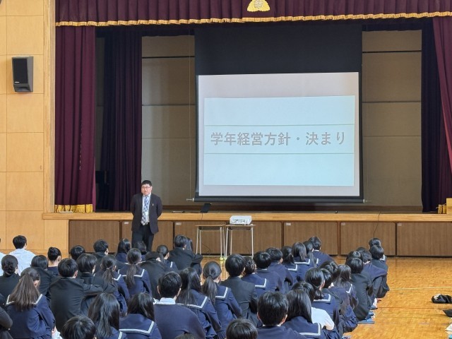 学年集会を行いました。学年目標の発表と「学びの作法」についてのお話がありました。