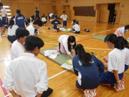 2・3枚目は、親子による講話、体育館にて人形抱っこ体験と妊婦体験をしている様子です。実際に妊婦体験をし、様々な体勢をして、思うように体を動かすことできないことを実感していました。