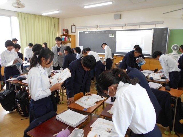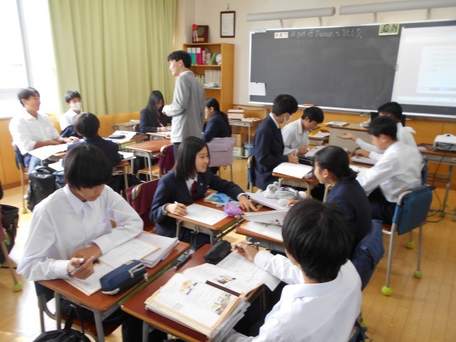 前半は、道案内についてリスニングを行い、そこから分かったことを、2人1組のペアワークで説明し合いました。