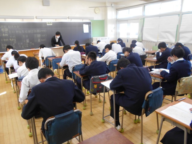 写真は、1時間目の国語の試験に取り組む2年3組の様子です。