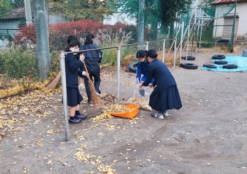 校庭や中庭に分かれて、たまった落ち葉を集めています。