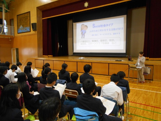 2年生は職場体験に向けた職業学習を実施。講師の若槻先生が来校し、先日取り組んだレディネステストを受けて、職業に関する講話を聞きました。(写真1枚目)