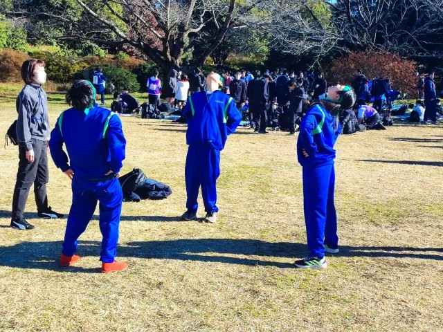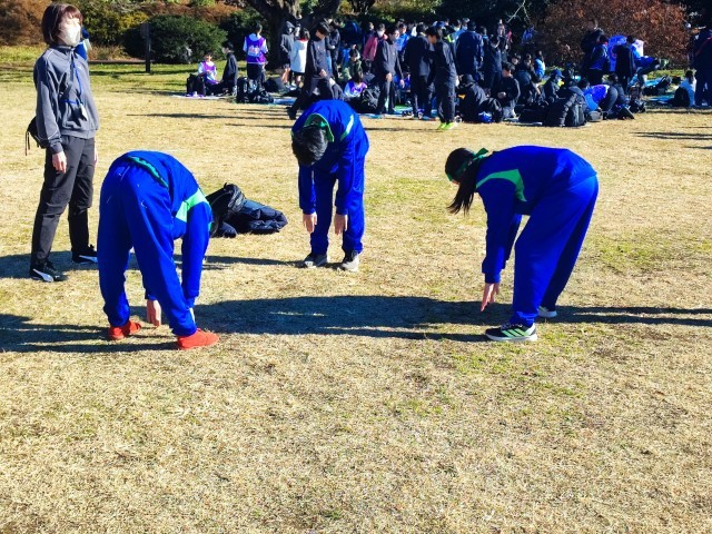いつも体育でやっているウォーミングアップをして軽く走って準備をしています。開会式はこのあと10時30分からでした。