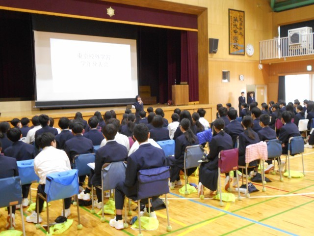 1時間目。1年生は体育館にて、東京校外学習でのまとめレポート学年発表会を行いました。