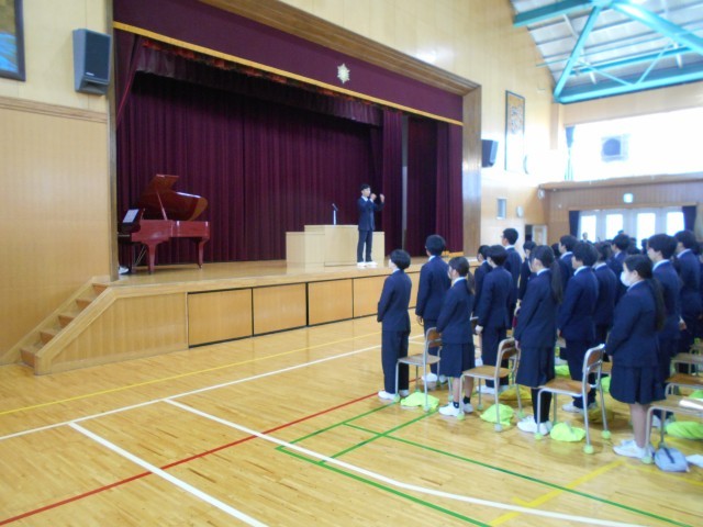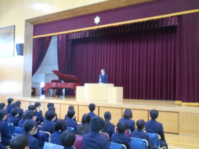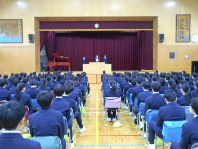 その後、生活指導主任の岩下先生から春休みの過ごし方についてのお話。最後に、先日の学校だよりでも紹介しましたが、各方面で活躍した生徒の表彰を行いました。