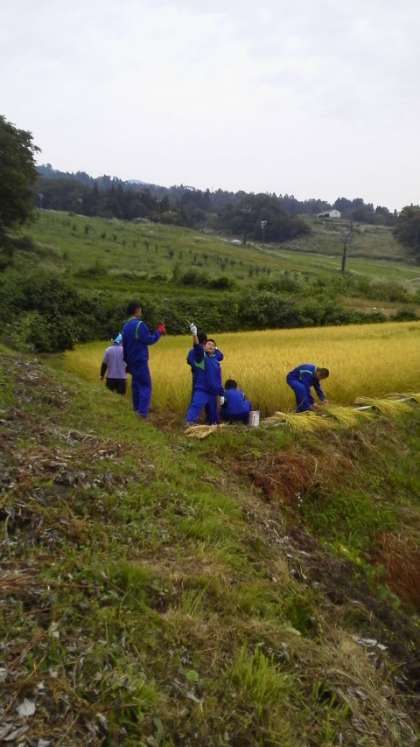 写真は稲刈り体験中の三組男子です。
