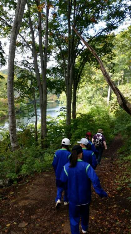 涼しく澄んだ空気の中、1組女子が茶屋池周辺を散策しています。