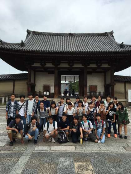 法隆寺見学先発隊が到着。みんな法隆寺の壮大さに自然と笑顔になります。