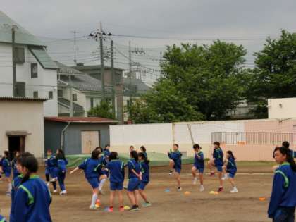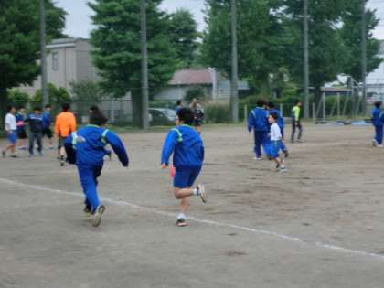 ・まずはウォーミングアップの「鬼ごっこ」約1分間の運動を4セット行います。