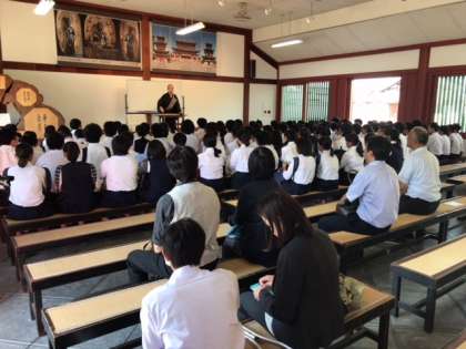 生徒達も、笑顔で、眠らず(笑)、講話を聞いています。