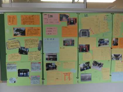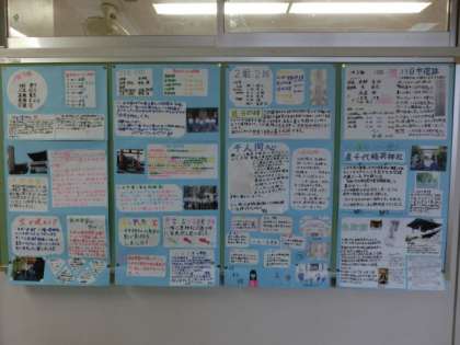 9月に行った「フィールドワーク」のまとめをしました。1年生教室前の廊下掲示板に張り出されています。