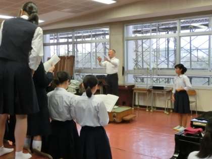 稲田教諭(音楽科)の研究授業を行いました。今月末にある音楽祭に向けて、3年生の合唱の授業でした。授業の後の協議会では、佐藤統括指導主事を講師にお招きして様々な視点からのご助言をいただきました。