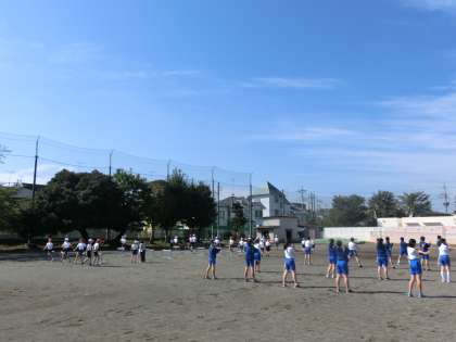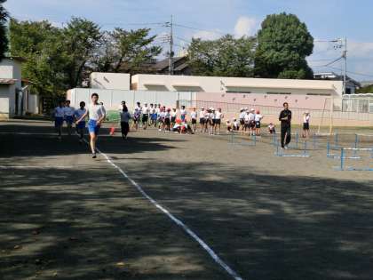 爽やかな秋晴れの下、小学生・中学生が同じグランドの中でそれぞれの授業が行われています。小学生(6年)は中学校の先生によるハードルの授業(トラックの中)、中学生(3年)は、200mトラックを使用して長距離走の授業です。