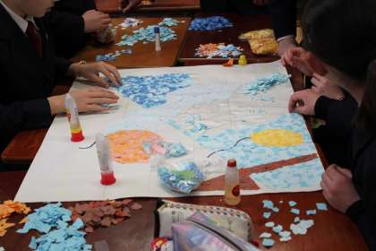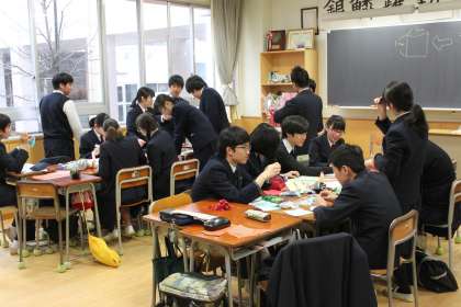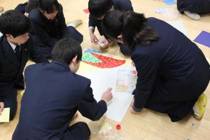 卒業パネル製作(切り絵)を始めました。各クラスグループ毎にパーツを分担し、和やかな雰囲気で取り組んでいます。どんな作品が出来るか楽しみです。卒業パネルは、1年間体育館南側に飾られます。