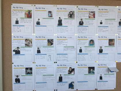 3年生の教室の前に、英語の授業で行った「My Life Story」が掲示されています。自分の幼少時期から現在までを、英語で紹介しました。