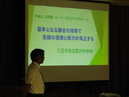 平成29年度、30年度東京都教育委員会スーパーアクティブスクール指定校の発表会を行いました。日本学校体育研究連合会 事務局長の後藤先生、東京都教育委員会の唐澤指導主事、八王子市教育委員会 安間教育長をお迎えし、本校の保健体育科主幹教諭の平山が、第六中での取組と成果を発表しました。