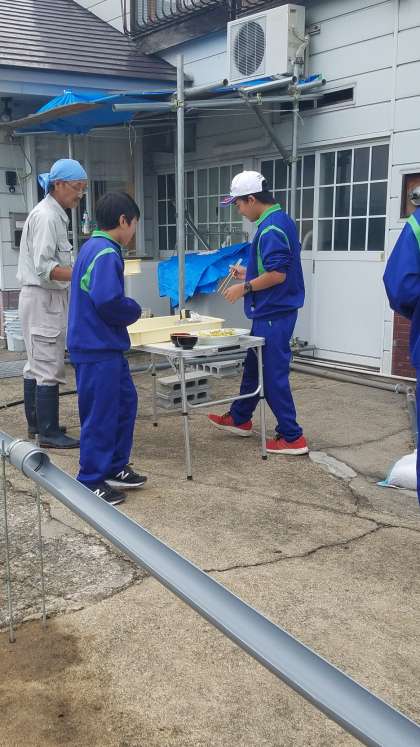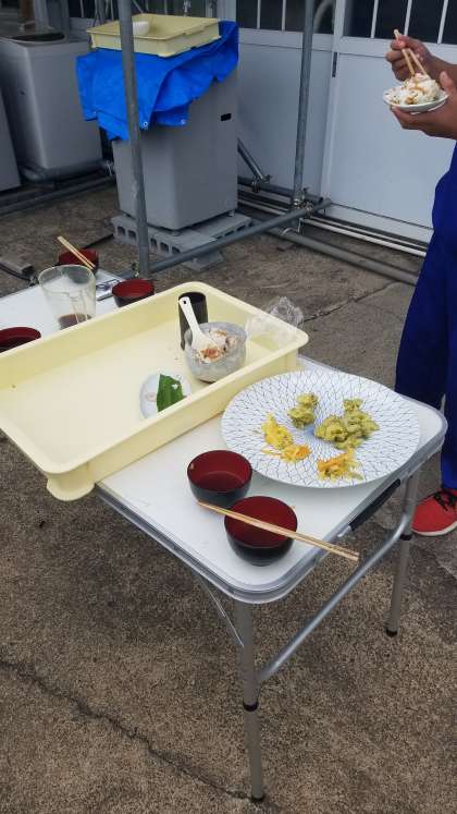 お昼ごはんに流しソーメンならぬ、流しそばをしている班がありました。