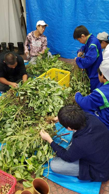 畑から落花生を抜いてきて、草をとって分別をしていました。