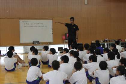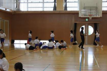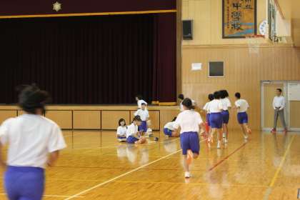 保健体育科の校内授業研究を行いました。陸上競技の長距離走です。雨が降ってきたので体育館での様子です。