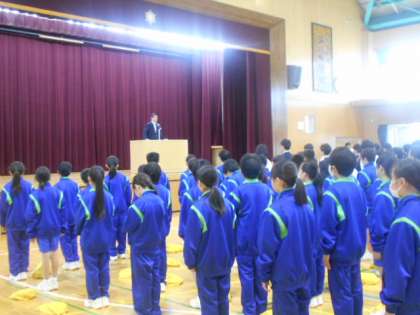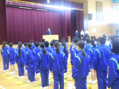 本日、朝礼を行いました。校長先生からは体育大会で一人一人が責任をもってよい体育大会を作り上げていきましょう。というお話がありました。生徒会からは、体育館の昼休み開放は体育大会終了後から使用できるというアナウンスがありました。生活指導主任の先生からは、自転車の乗り方や体育大会等で他校には行ってはいけないという指導がありました。