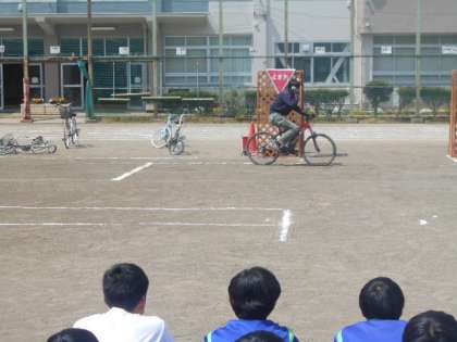 本日、八王子警察の交通課の方とWILD STUNTS(スタントマン)の方をお招きして交通安全教室を行いました。自転車の乗り方や交通事故の再現などから交通事故の恐ろしさを学びました。