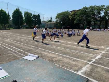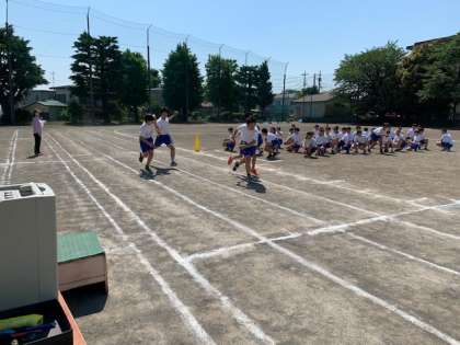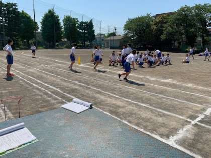 1回目の学年練習は、雨のため体育館での練習でした。今日は、天候にも恵まれ校庭で練習することが出来ました。最初に全員リレーを行いました。