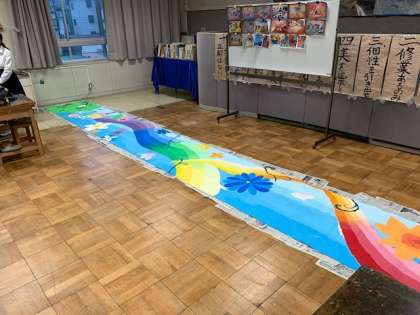 美術部では、音楽祭で使用するつり看板を作成しています。仕上げるために、土曜日も今週は活動があります。完成を楽しみにしてください。