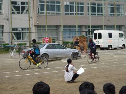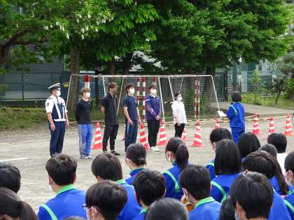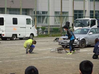 本日の5.6校時の授業はスタントマンによる交通事故疑似体験を取り入れた交通安全教室を行いました。第1部はスタントマンによる交通事故の実演と説明を行いました。実際に自動車と自転車がぶつかる場面や人が車にはねられる実演もあり(もちろん訓練を受けたスタントマンが防具を入れ受け身を取っているのでけがはありません)生徒たちは皆固唾をのんで実演を見ていました。第2部は生徒の代表が自転車での片手運転や2人乗りの体験をしました。体験した生徒は普通でない乗り方をした場合にいかにコントロールが難しくなるかを実感することができました。