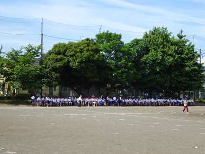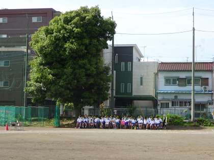 日差しがとても強いので熱中症対策として生徒席を3か所にまとめ、日陰に入れるように配置しました。当日は生徒席にテントをはり日陰を作る予定です。