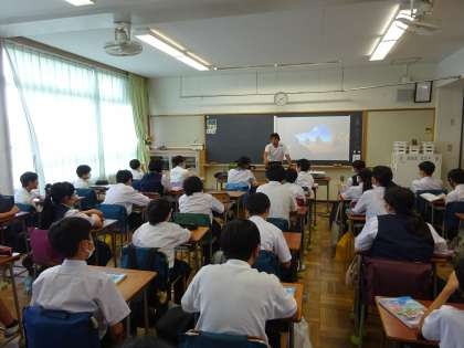 1年2組の保健体育の授業では、翌週からの水泳授業についての説明があり、生徒たちからは、プールでの授業をとても楽しみにしている様子が伝わってきました。(1枚目)
