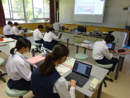 2年1組の技術の授業では、文書作成ソフトを活用したレポート作りが行われていました。生徒によっては、大人顔負けのかなり手の込んだものが作られています。(2枚目)