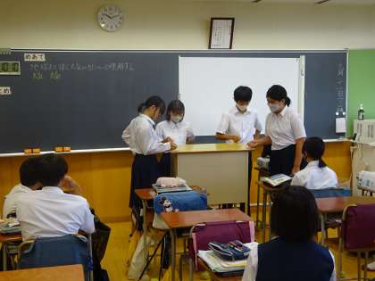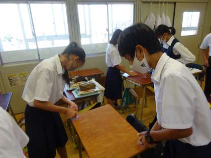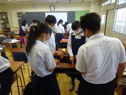 週明けの月曜日。2年3組の理科の授業では、先週の授業の振り返りの後、「地球をとりまく大気の力について理解する」をねらいに、吸盤を用いた実験を行いました。