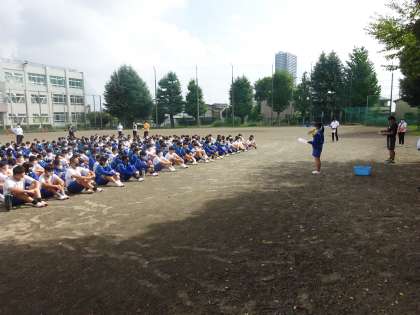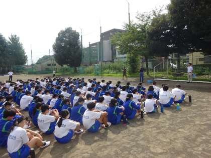 初めに、地震を想定した避難行動を行い、校庭に集合した後、開会式を行いました。生徒会長の初めの言葉、消防署の方のあいさつなどの後、9つのグループに分かれて、それぞれ3つの体験を行います。