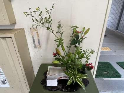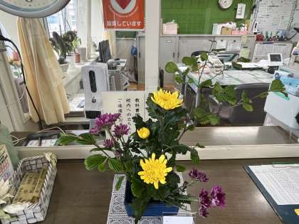 5月に入りました。朝、校内を見回っていると、昨日実施した「生け花教室」で生けた花が見られました。とても素敵な出来映えです。写真1枚目は1階の職員室階段前。2枚目は職員玄関事務室前の生け花です。