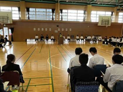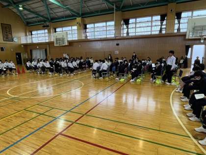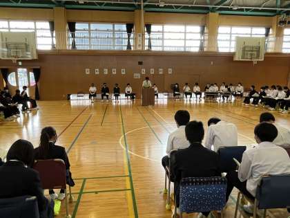 5時間目は、生徒総会を開催。生徒会ならびに各専門委員会からの活動方針と、議案書討議を経ての返答が発表されました。写真は、体育委員会(1枚目)と、1年学級委員会(2枚目)の発表です。終了後は生徒会企画「ディベート」が行われ、学校に「きまり」は必要か必要でないかについて、多くの生徒から活発な議論が飛び交いました。