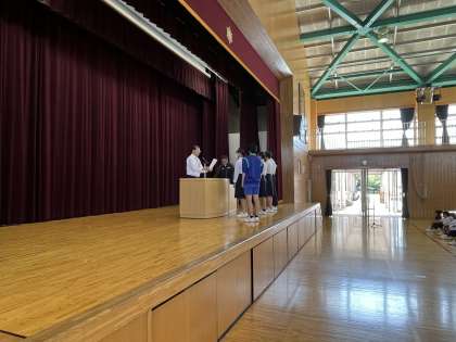 続いて、各種大会で輝かしい結果を残した陸上部の表彰が行われ、最後に生活指導主任の齋藤先生から、下校時の「行動」と日々の学校生活での「凡事徹底」についてお話がありました。今一度、足下をしっかりと見つめて、期末考査に向けて頑張ってほしいと思います。