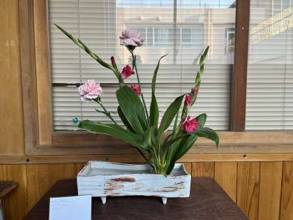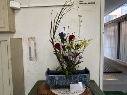 写真1枚目は、2階心の教室前。写真2枚目と3枚目は、1階職員室前の生け花です。