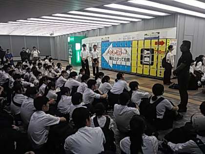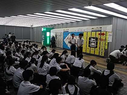 たくさんの学校が地下に集まっています。実行委員会の司会で進めています。