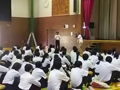 最初にお互いにあいさつをしたあと、はじめに六中の代表生徒により、今まで学んできたことについて発表しました。