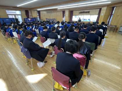 3年生は、学年集会を実施。(写真)間近に控えた上級学校への入試に向けての動きの確認を行いました。生徒たちの表情からは、緊張感が伝わりました。
