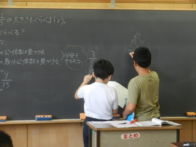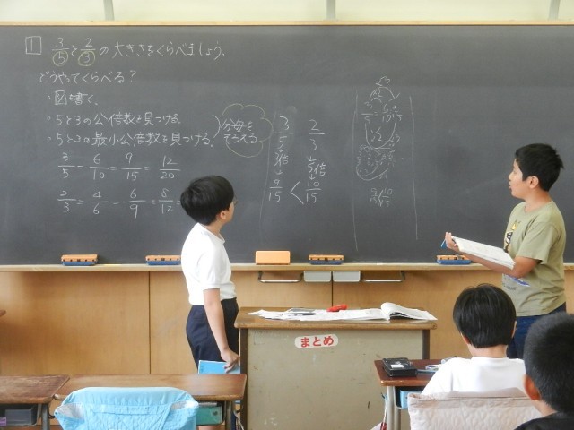 続いて、情報共有・全体共有の時間です。今回は、2名の代表者が黒板の前で説明をしました。上手です。