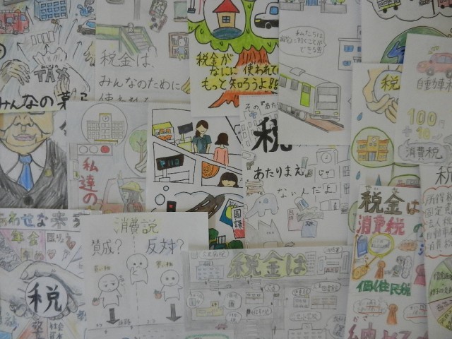 一人一人が「税金」について学習したことをイラストや標語で表現します。