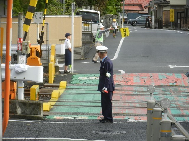 踏切のそばも、交通安全協会の方や安全ボランティアの方は立っています。