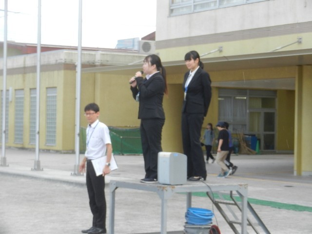 9月29日・月曜日の全校朝会で、2名の教育実習を全校児童に紹介しました。