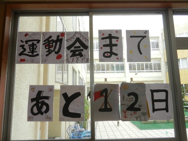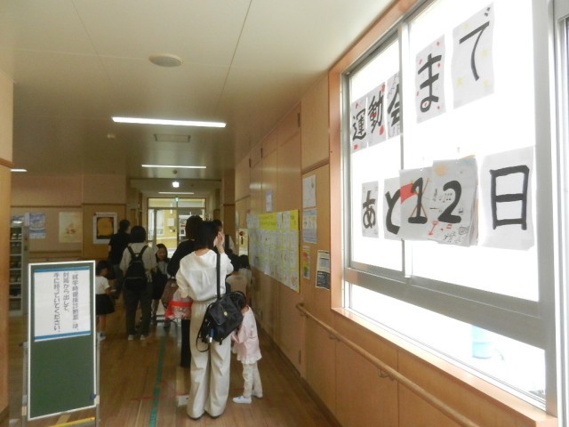 昇降口にあるのは、運動会までのカウントダウンポスターと紅白キャラクター応募の様子です。