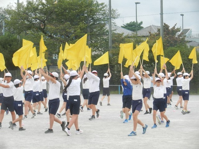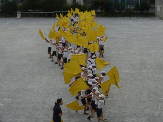 校庭では6年生が運動会の表現の練習中です。大きな旗(フラッグ)を持ちます。旗を振ると、バサッ、バサッと音がします。