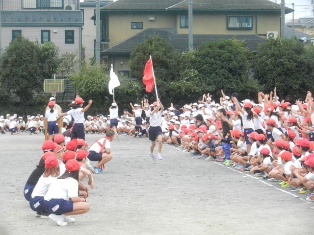 紅白応援団長の声に合わせて、全校児童が声をあげます。今年の応援合戦も迫力があります。素晴らしいです。
