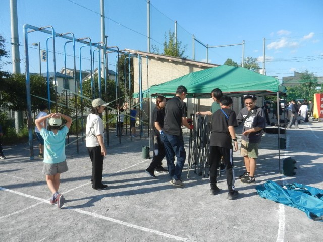 テントを近隣の学校から運搬してくださったのは、用務主事さんと学校長です。たくさんのテントを組み立ててくださったのは、PTAの方々、親児の会の方々、教職員です。大人の力はすごいです。